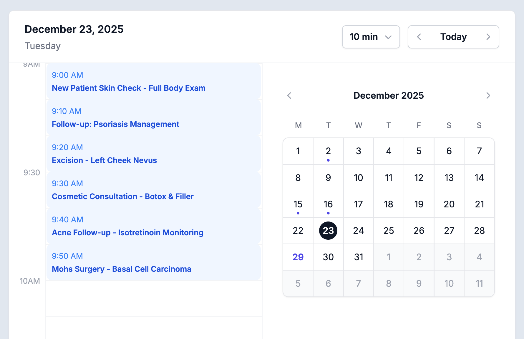 See your patient encounters organized chronologically. The calendar view helps you track which visits have been documented, identify any recordings that need attention, and maintain a clear overview of your clinical day.