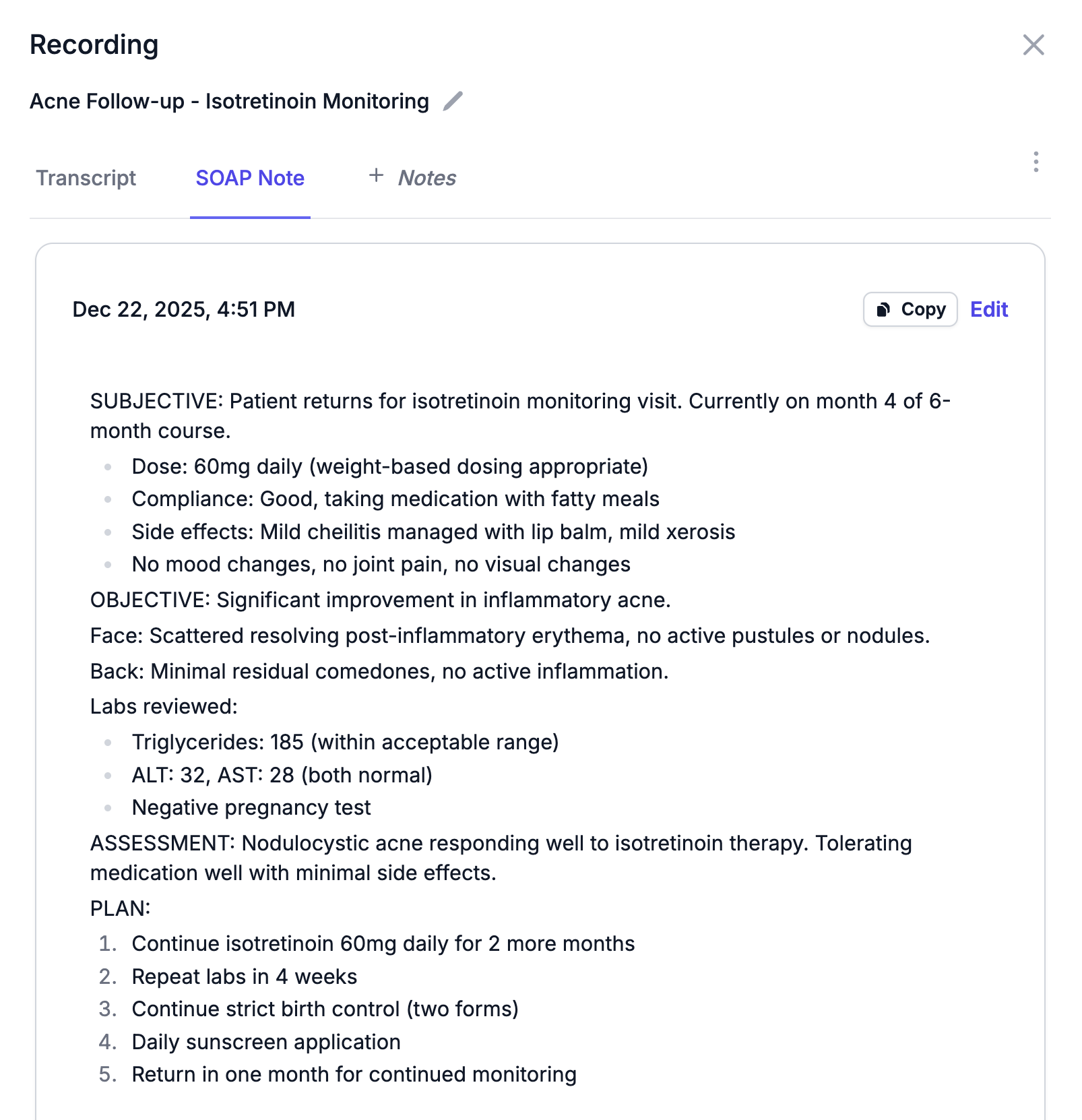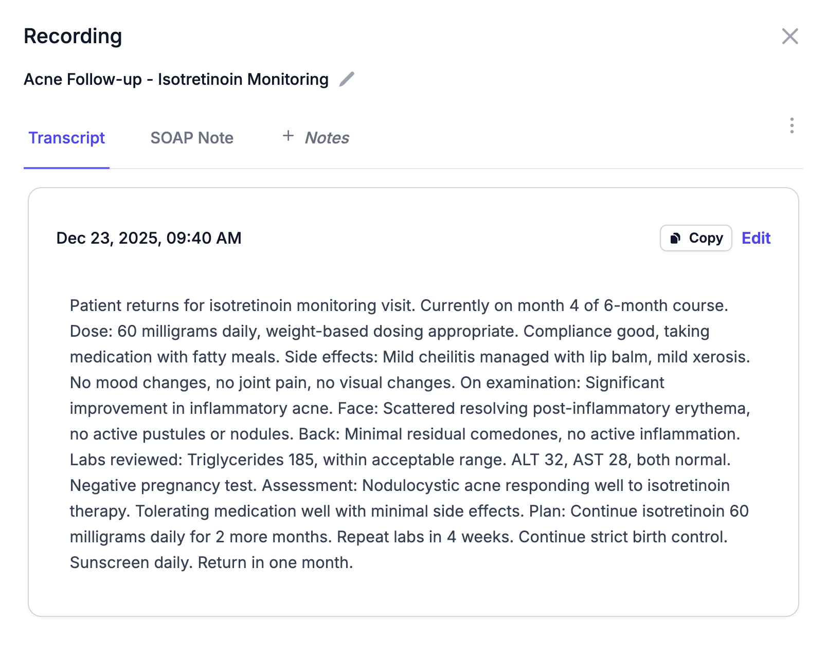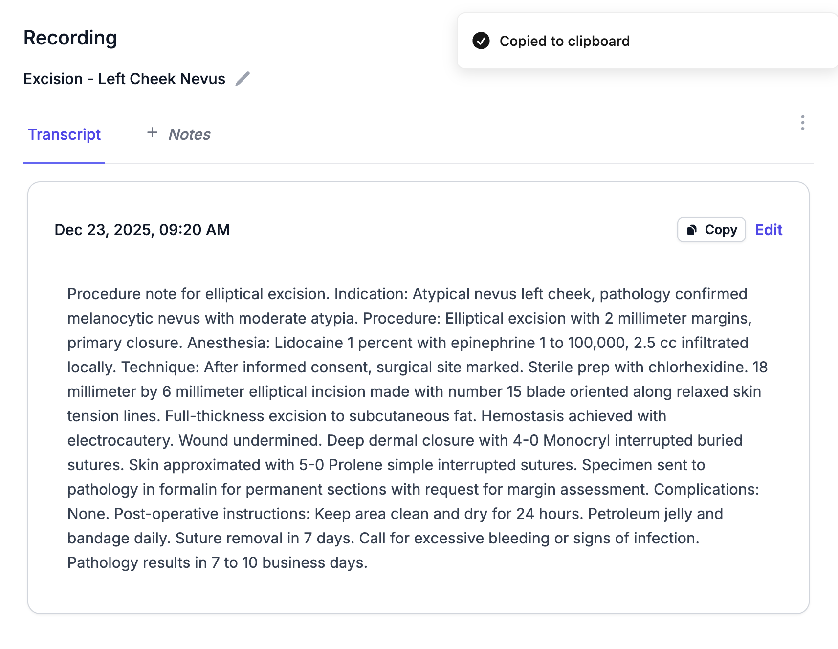 Review and refine your documentation before finalizing. Make any adjustments you need, then copy the complete note directly into your electronic medical record. No complex integrations required—just straightforward copy and paste.
