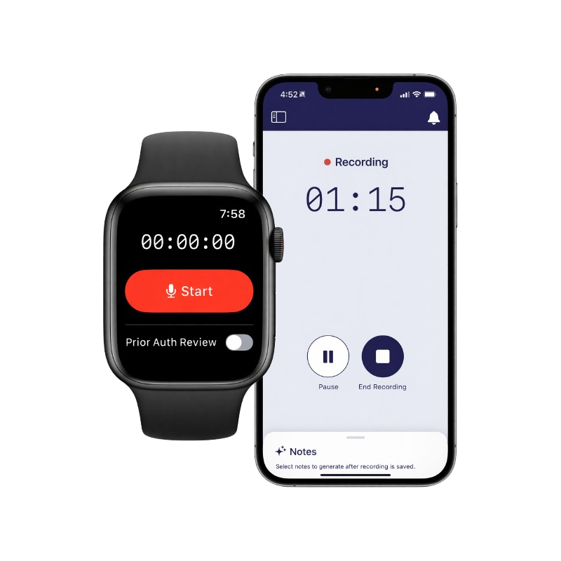 Record on your Apple Watch during exams with gloved hands, or use your iPhone when it's convenient. Both options sync seamlessly to your account, giving you flexibility for any clinical situation. Your recordings are transcribed automatically.